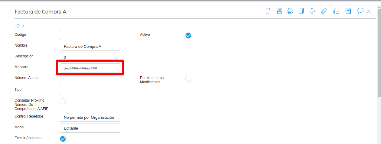 - En el campo Máscara, indicar el símbolo elegido para los 13 caracteres del talonario