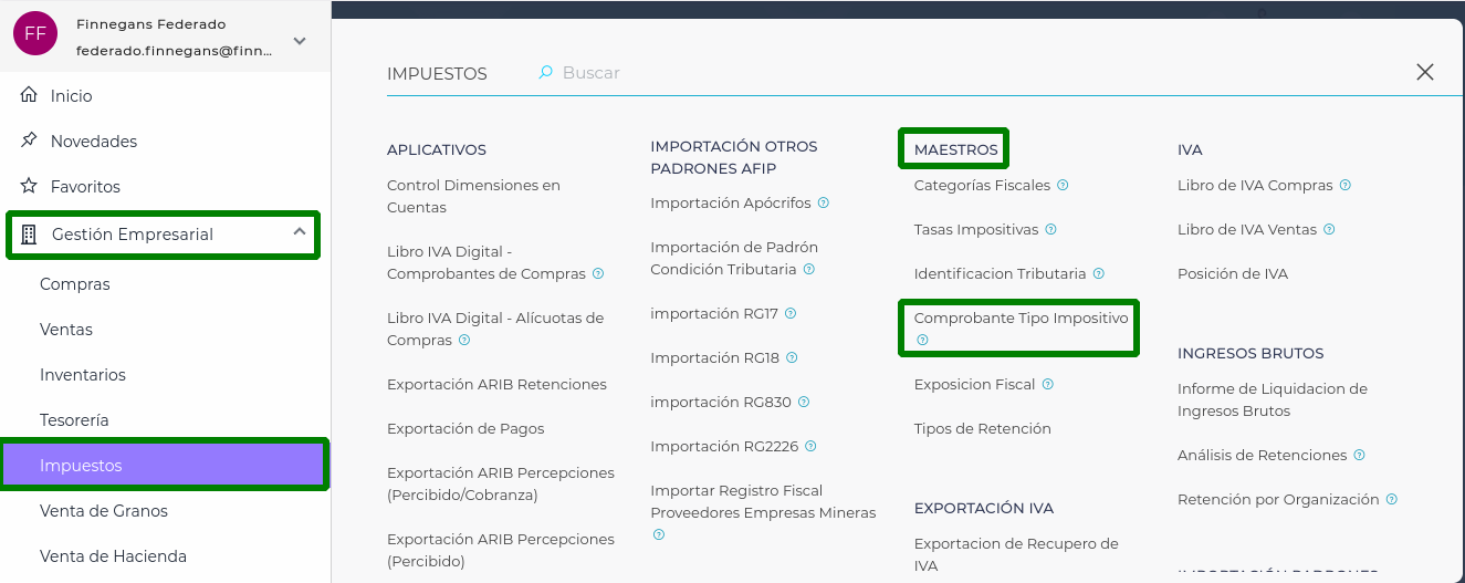 1) Ingresar al menú de gestión empresarial > impuestos > comprobante tipo impositivo