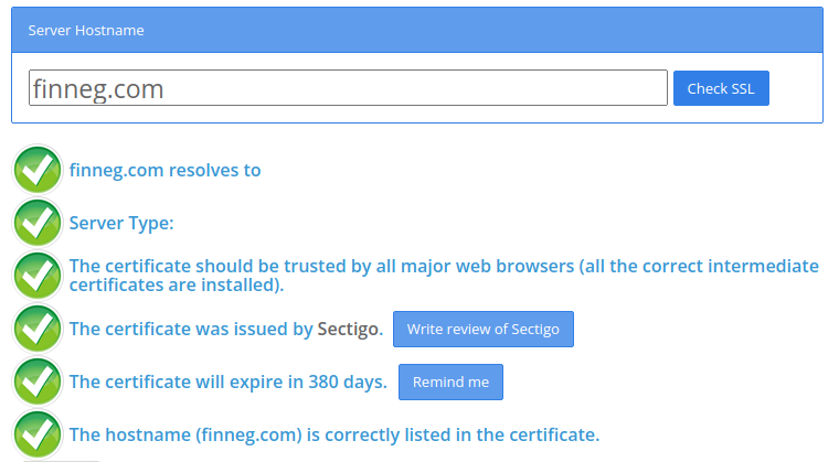 Ingresar a SSL Checker, escribir el DNS y darle a ‘Check SSL’. Todos los tildes deben salir en verde: