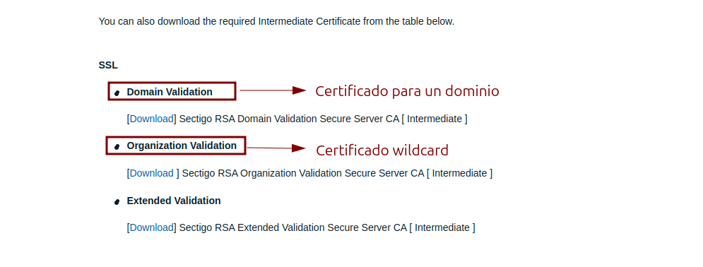 Para el caso del certificado intermedio o bundle, se debe acceder al repositorio y descargar el archivo .pem