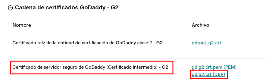 Para utilizar GoDaddy, se debe descargar el archivo pfx para extraer el certificado y la key