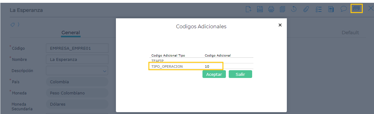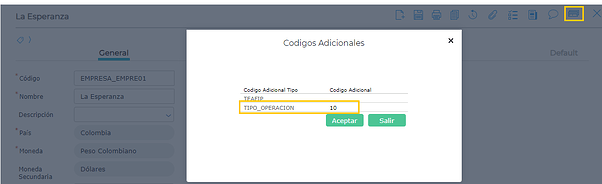 En el maestro de empresa se debe completar el código adicional TIPO_OPERACION según:
