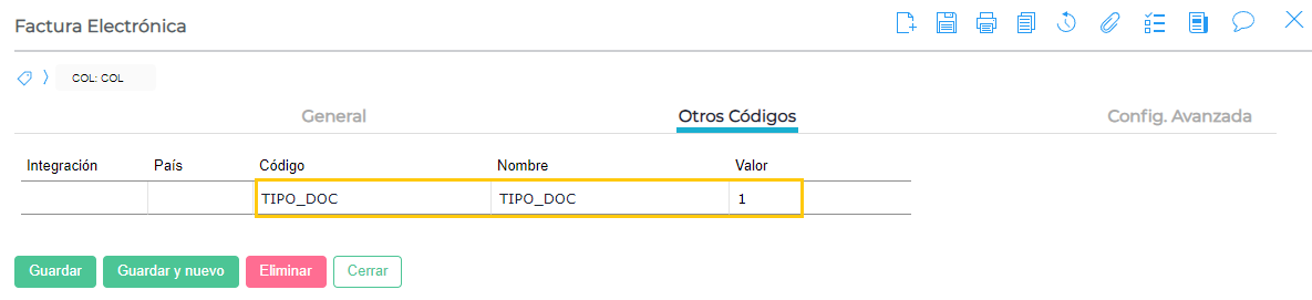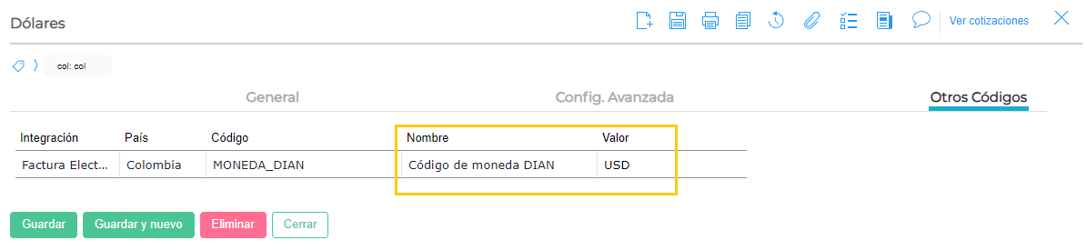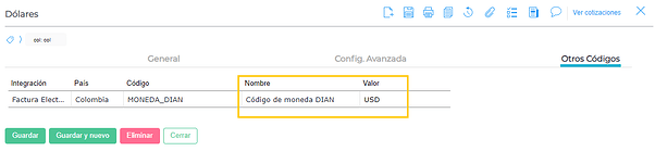 En las monedas se debe configurar el código adicional MONEDA_DIAN según la siguiente tabla: