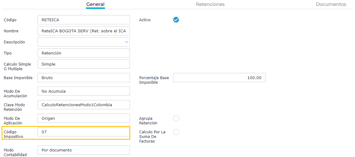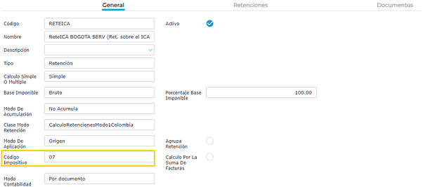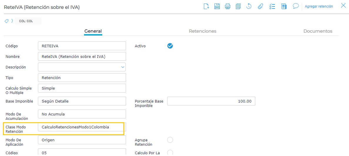 - En la solapa General, se debe completar el campo Clase modo retención con CalculoRetencionesModo1Colombia