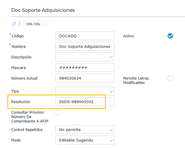 En el talonario del Documento Soporte, se debe completar el campo Resolución
