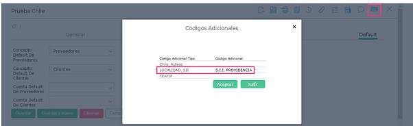 Y desde el botón de códigos adicionales, se debe completar el campo Localidad SII con la localidad donde está registrada la empresa