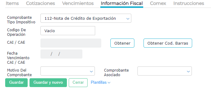 Tanto en las notas de crédito locales como en las del exterior se deben completar los campos Motivo del comprobante y Comprobante asociado ubicados en la solapa Información Fiscal.
