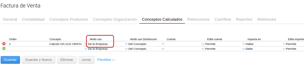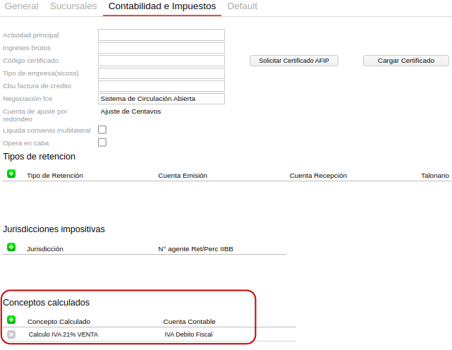 Una vez creadas las cuentas mencionadas anteriormente, configurar los conceptos calculados en los tipos de documentos a utilizar.