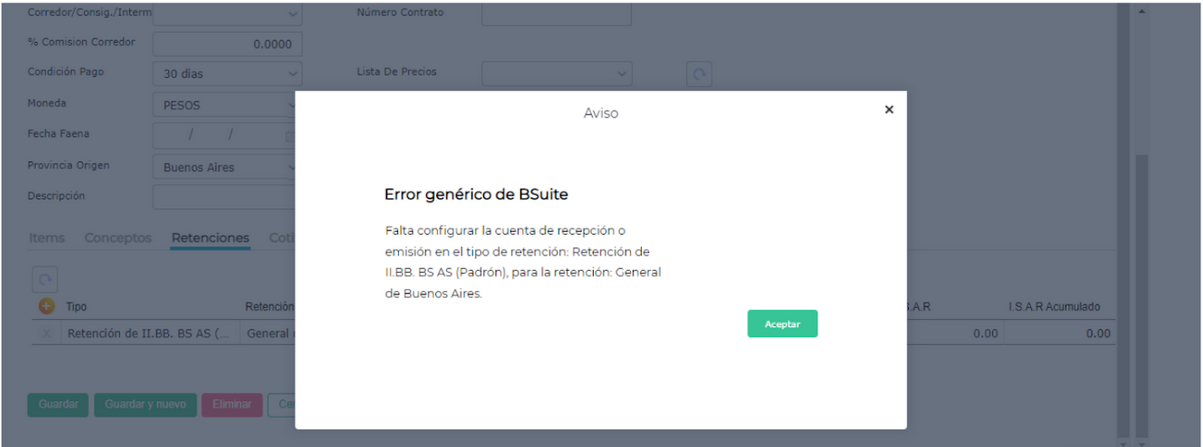 Consulta: El sistema arroja un mensaje: “Falta configurar la cuenta de recepción o emisión en el tipo de retención, al querer guardar una transacción”.