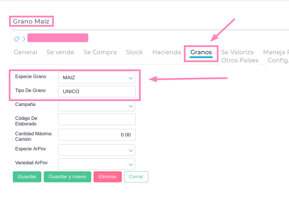 Para configurar la especie en un producto que es Grano seguir estos pasos :