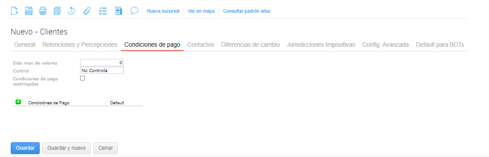 2-En el registro del cliente, buscar la solapa “Condiciones de pago”.