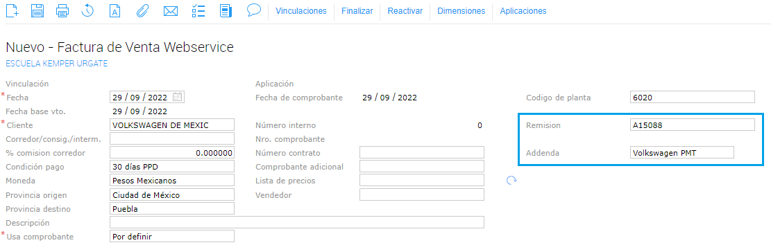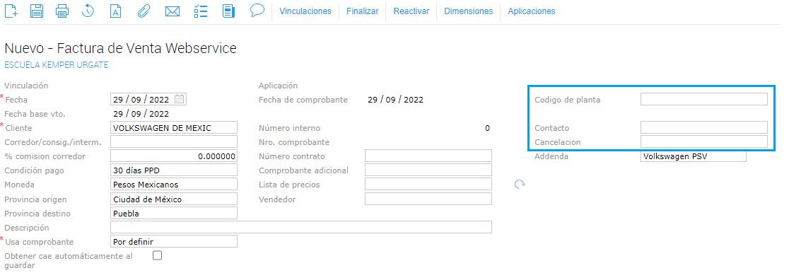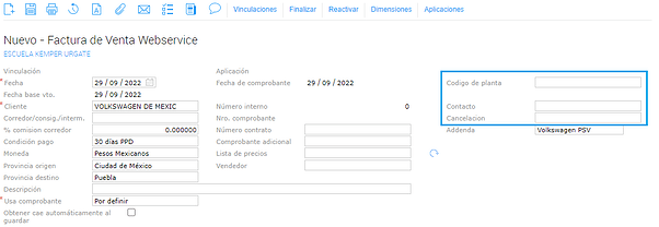 Para utilizar esta addenda se deben completar los campos Contacto y Cancelación. Además del campo planta mencionado anteriormente.