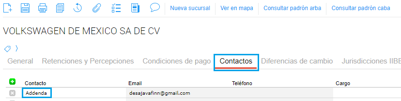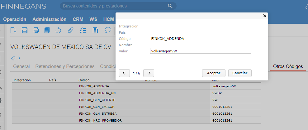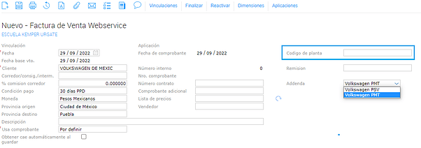 En el cliente Volkswagen, se debe indicar en el campo FINKOK_ADDENDA de la solapa Otros códigos, el valor volkswagenVW