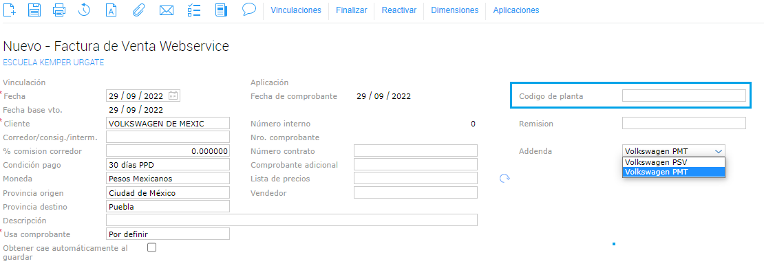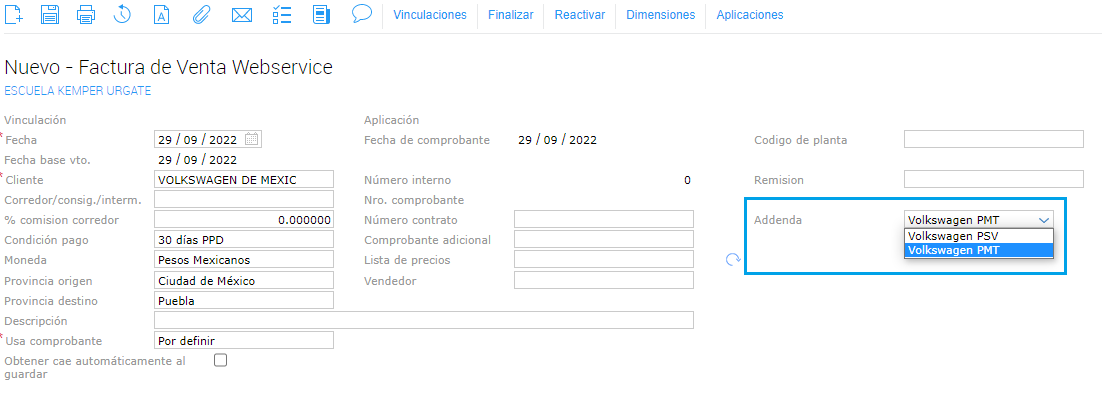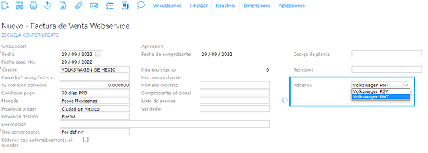 Al seleccionar el cliente, se habilita un campo donde se puede seleccionar una de las addendas disponibles. Al momento son PSV y PMT