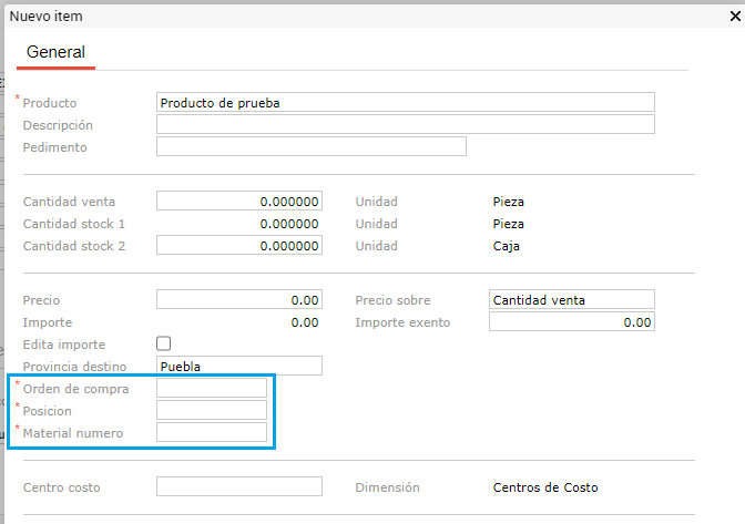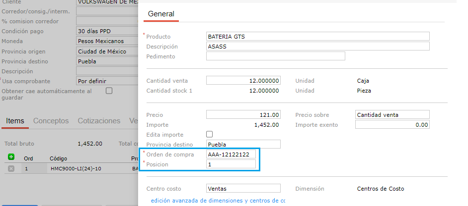 A nivel ítem se deben completar (en cada ítem), Orden de Compra y Posición