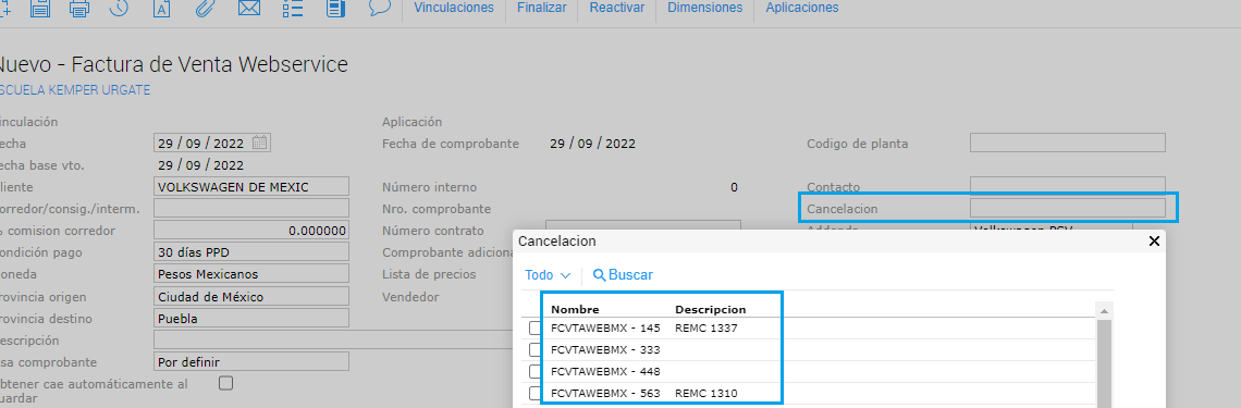 Cuando por algún motivo se requiere anular una factura, se debe informar la nueva factura en el campo Cancelaciones.