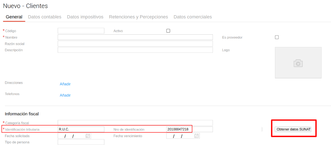 Es importante que al momento de presionar el botón Obtener datos SUNAT, los campos de nombre, razón social y dirección se encuentren vacíos.