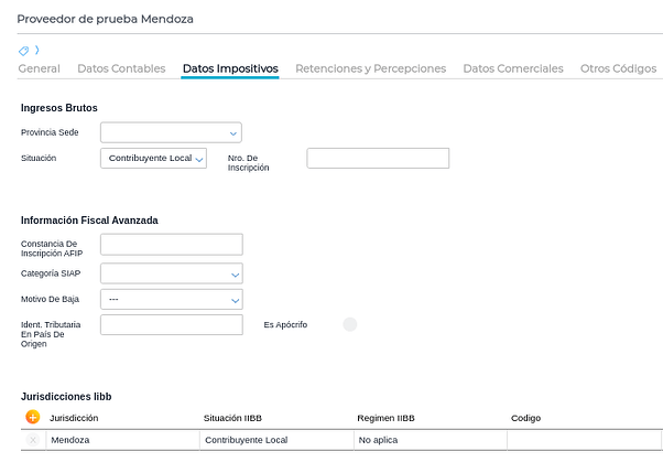 *En este caso, es importante como lo mencionamos que tenga dada de alta la provincia de Mendoza en la solapa de Datos Impositivos.