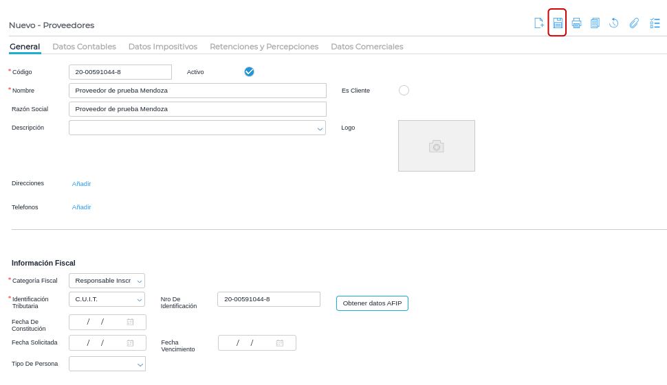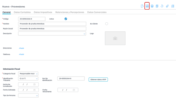 Si damos de alta un proveedor que se encuentre dentro del padrón de Mendoza, podemos observar que al guardar se va a cargar automáticamente la alícuota correspondiente a aplicar para ese mes: