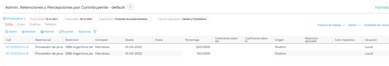 Podemos observar, que en la vista de Admin. Retenciones y Percepciones por Contribuyente se le pegaron las alícuotas para dicho proveedor.