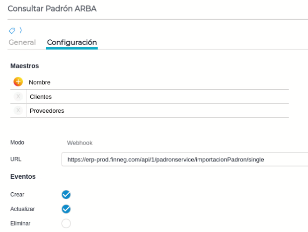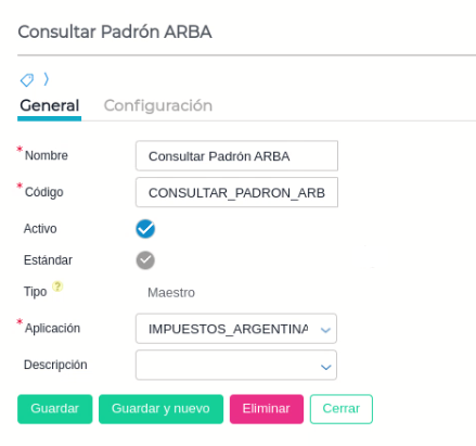Dentro de la solapa “Configuración” podemos observar que la ejecución del bproc aplicará tanto a Clientes como a Proveedores. Lo que significa que cada vez que se creé o modifique algún cliente/proveedor se ejecutará, una vez presionado el botón “Guardar”, la acción de consultar en el o los padrones la información correspondiente, únicamente para dicho cliente/proveedor.