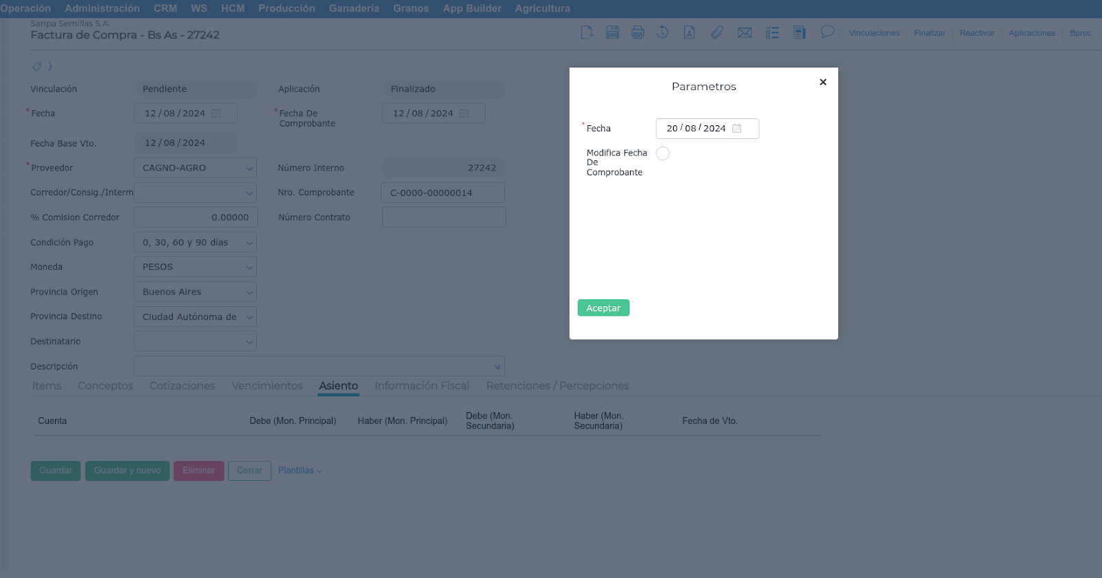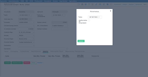 La fecha ingresada podrá ser diferente a la del comprobante, y brinda por default la del día en la que se está realizando la contabilización. Por el contrario, si se desea también modificar la fecha del comprobante, con la fecha default o ingresada manualmente, se deberá tildar la opción de “Modifica Fecha De Comprobante”.