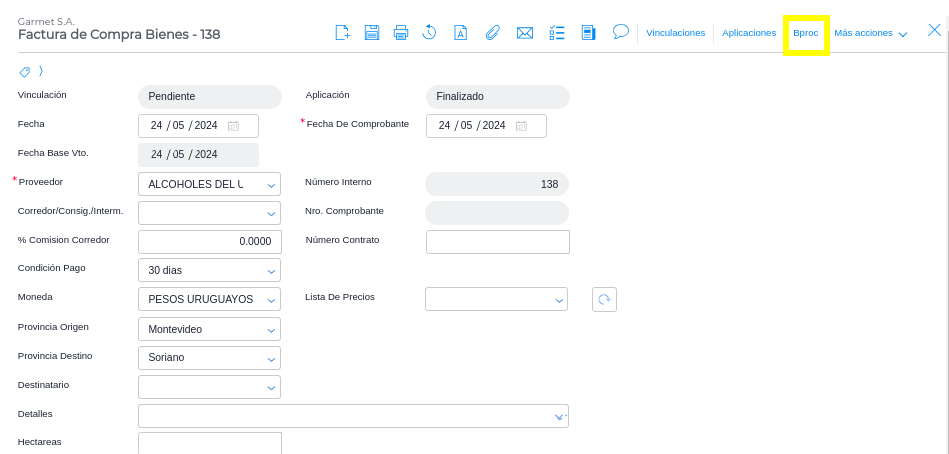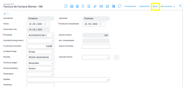 Además quedará visible en la parte superior de la misma el Bproc activo, para contabilizar desde el documento una vez que el mismo haya sido guardado.