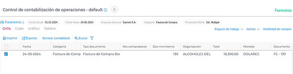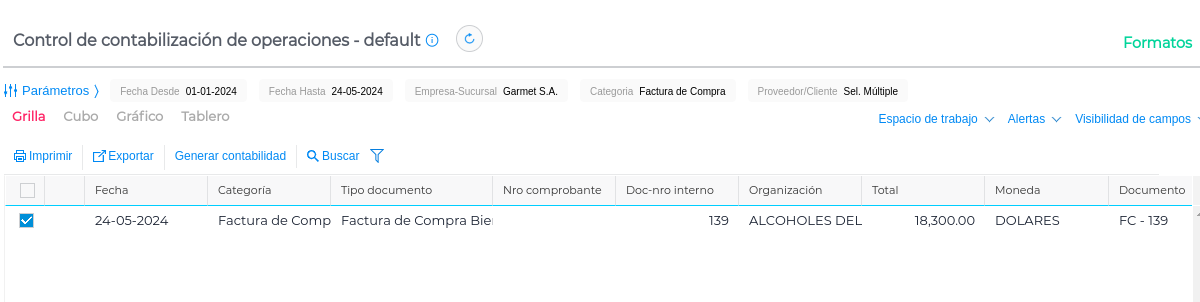 Una vez indicados los parámetros se visualizarán los documentos con esta configuración pendientes de contabilización y se podrán tildar para luego indicar la fecha a considerar: