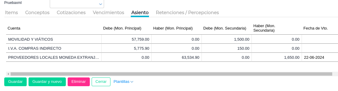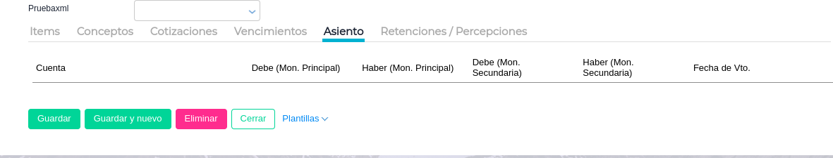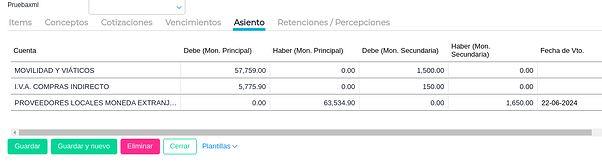 Al crear una factura de compra con la configuración mencionada anteriormente, la misma quedará guardada con la solapa Asiento en blanco.