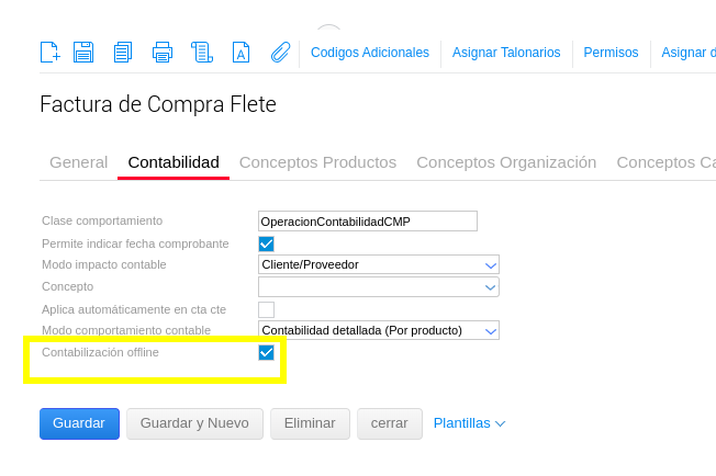 Dentro de Tipos de documentos se debe ingresar a los documentos con Categoría “Factura de compra” que requieren esta funcionalidad e indicar en la solapa Contabilidad con un tilde la opción “Contabilización offline”.