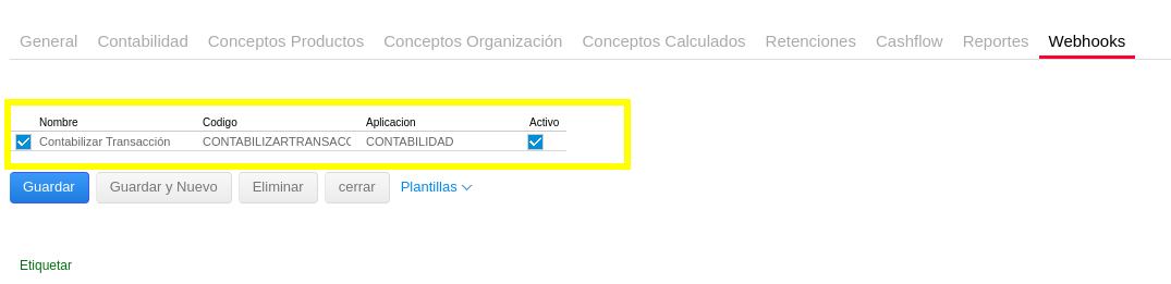 En este maestro de Bproc se encontrará disponible el Bproc estándar “Contabilizar Transacción” que es el mencionado en el paso anterior que debe quedar activo y tildado en la solapa Webhook del documento para poder ser utilizado.