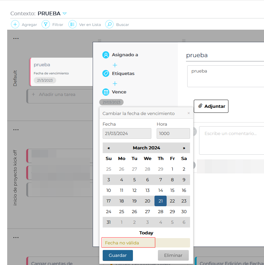 Al generar una nueva tarea en contextos, y colocar vencimiento, da el mensaje de “Fecha no válida” y no permite guardar.