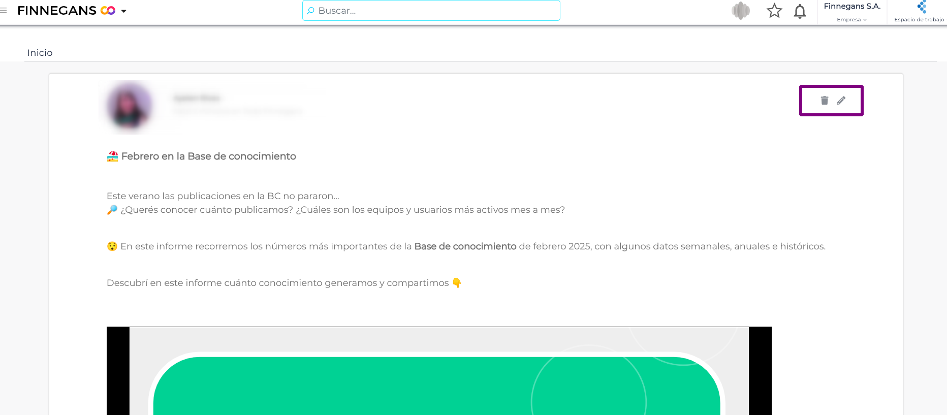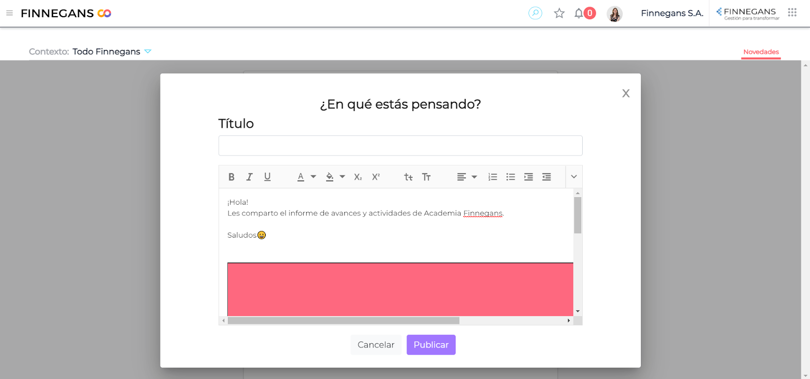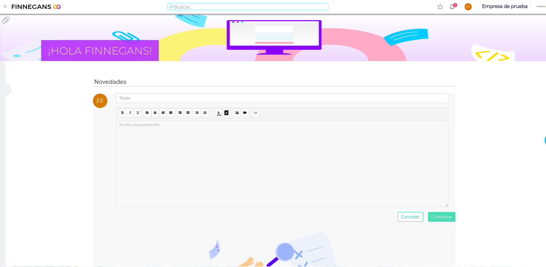 Al ingresar en Finnegans GO, en la home, bajo el título de las Novedades, aparece un recuadro con la leyenda: “Publicar una novedad”
