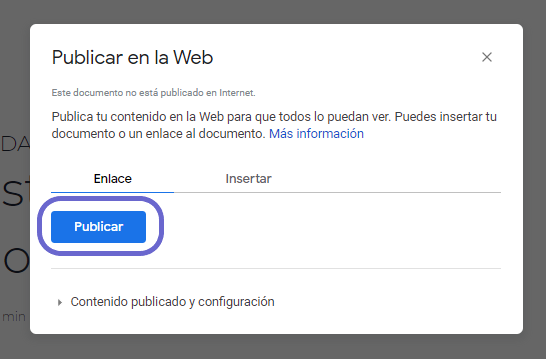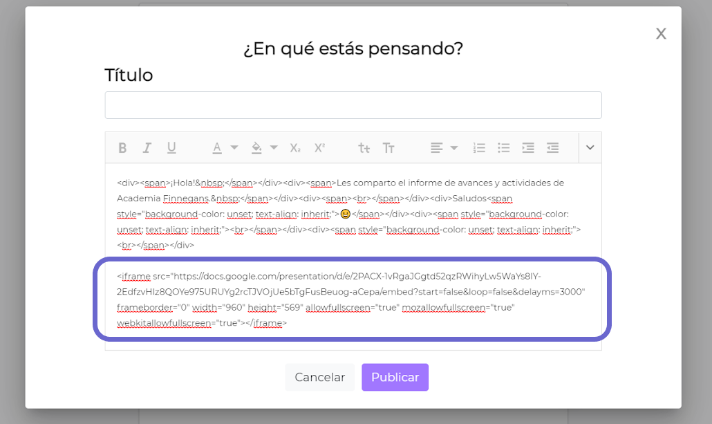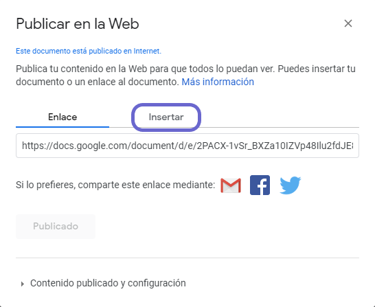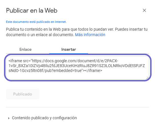 Para insertar un documento de Google en el cuerpo de la publicación, se lo debe agregar con código embebido.