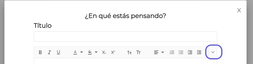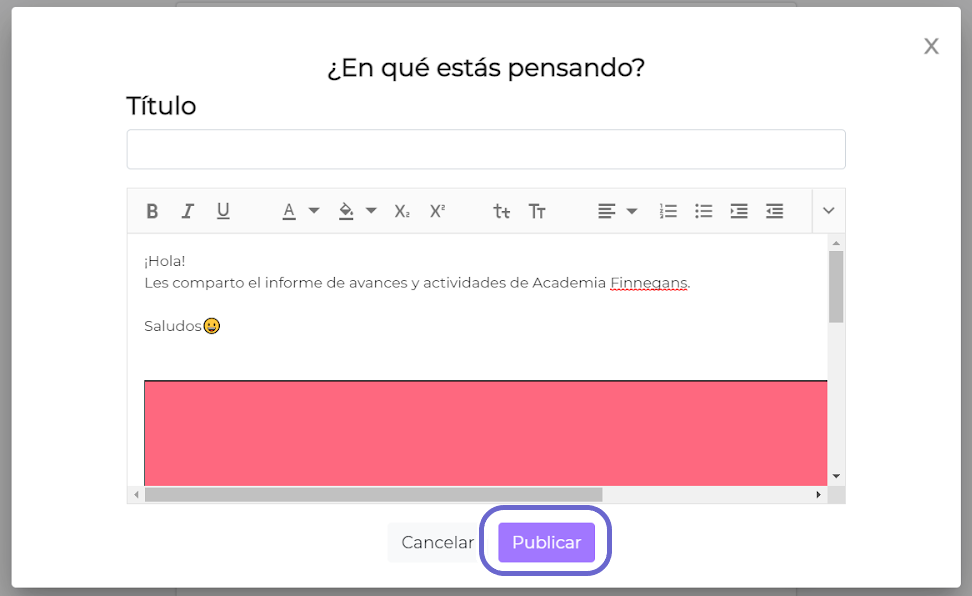 Al hacer click en el recuadro, se despliega la caja de texto con lugar para el título y el cuerpo de la publicación con las opciones de edición de texto. Completar la publicación siguiendo los pasos 4 y 5 de la indicación anterior. Una vez completa la publicación, hacer click en el botón Continuar.