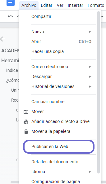 Una vez en el documento, hacer click en Archivo > Publicar en la Web