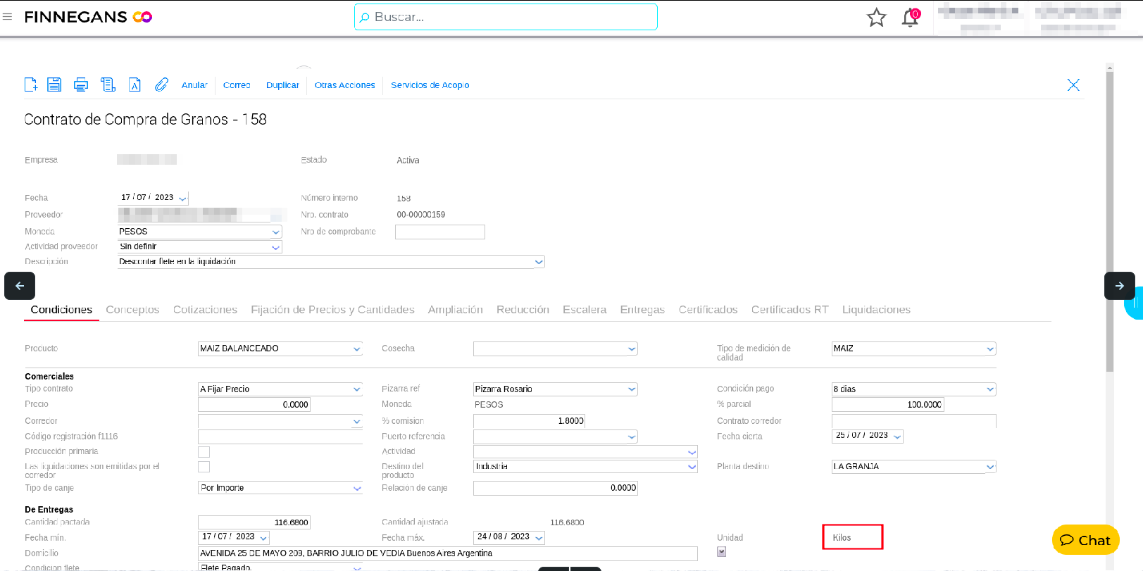 Al cargar un contrato de compra de granos, en el cual el producto en cuestión se compra en toneladas y se stockea en kilos; dicho contrato se guarda un kilos.