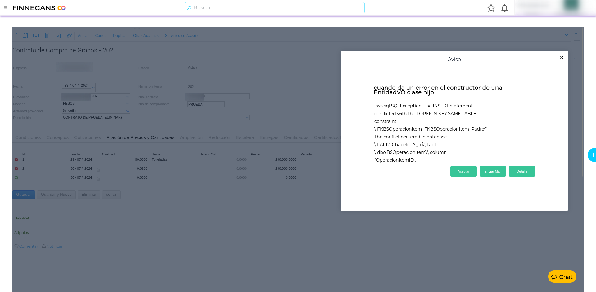 Al querer guardar una fijación de precios y cantidad en un contrato de compra o venta de granos, el sistema arroja el siguiente mensaje y no permite guardar: