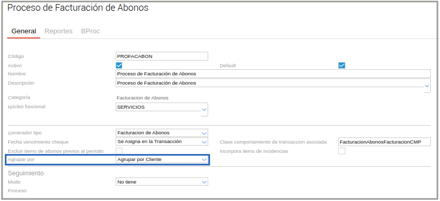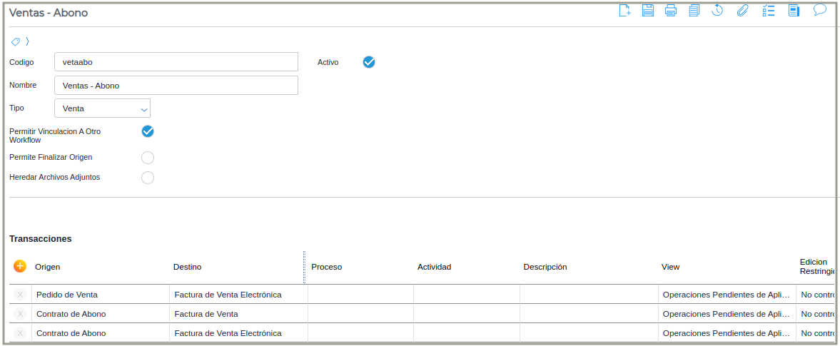 En el tipo de documento Proceso de Facturación de Abono se configura los documentos a generar (factura de venta y factura de venta para FCE) y la moneda default de la factura.