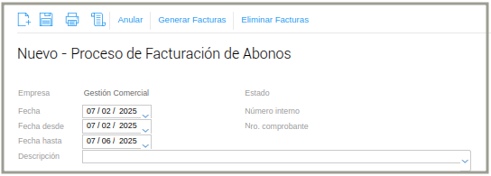 Desde el botón “Anular”, puede anularse el documento de Proceso de Facturación de Abonos, una vez que el mismo no tenga asociado facturas de venta.