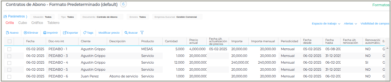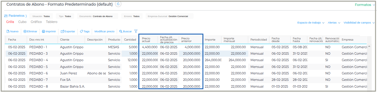 Fecha, Documento, Número Interno, Cliente, Descripción, Producto, Cantidad, Moneda, Precio actual, Fecha últ. Actualización de precios, Importe, Periodicidad, Importe mensual, Fecha desde, Renovación automática, Fecha última renovación, Fecha hasta, Empresa.