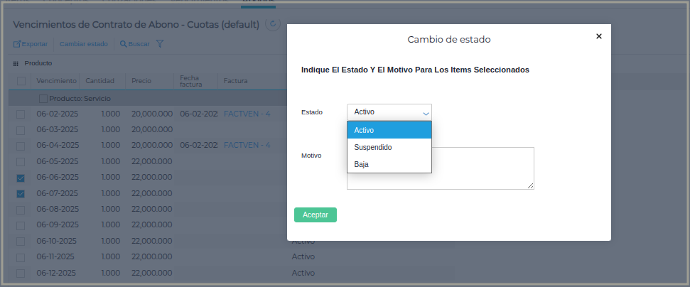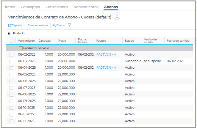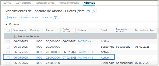 Tener en cuenta que cuando se suspende un ítem no se actualiza el precio ni se factura hasta cambiar de Estado.