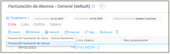 Se realiza desde: Gestión Empresarial → Ventas → Facturación de Abonos.