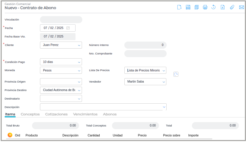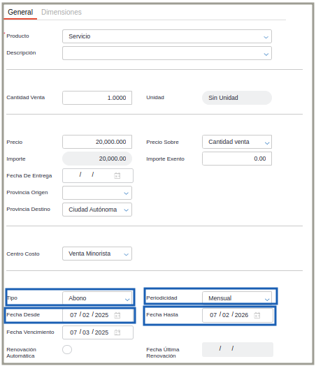 Contrato de Abono: los aspectos a destacar son el cliente y el monto del abono. Estas configuraciones definirán el tipo de documento que se va a generar en el proceso de facturación de abono.
