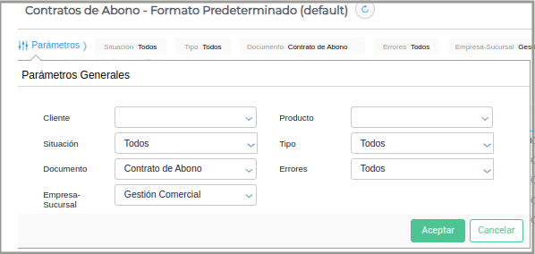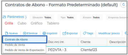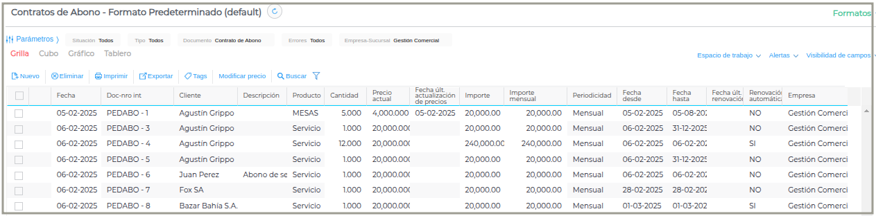 Se accede desde: Gestión Empresarial → Ventas → Contratos de abono.