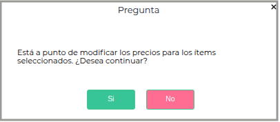 Hacer clic en “Aceptar”. Al clickearlo, saldrá un mensaje de alerta dónde pedirá que confirmes la acción de modificar precio, o caso contrario volverá al popup de edición: