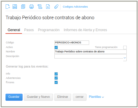Respecto a la actualización de los vencimientos, este proceso automático es el encargado de renovar los contratos. Según el parámetro de fecha interna del trabajo, es el día en que se van a actualizar los contratos hasta la próxima ejecución. El formato de la fecha en el parámetro debe ser YYYYMMDD.