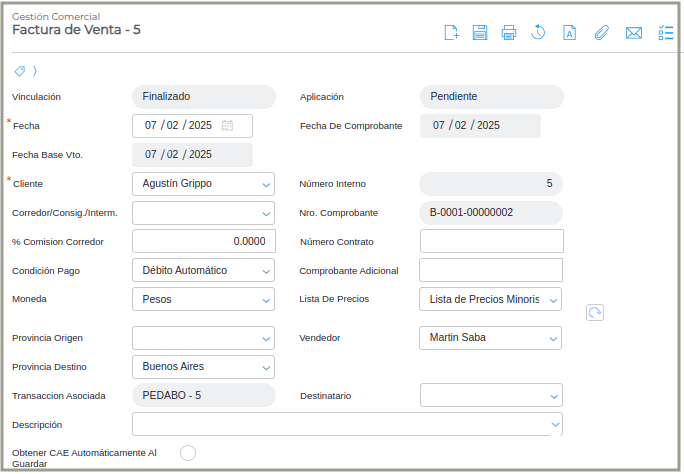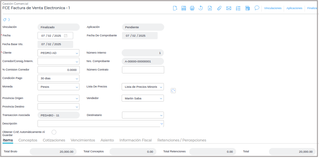 Factura de Crédito: se genera una Factura de Crédito electrónica, ya que, el cliente es de categoría fiscal FCE Responsable Inscripto y el importe de la factura supera el monto definido en la actividad que tiene configurada el cliente.
