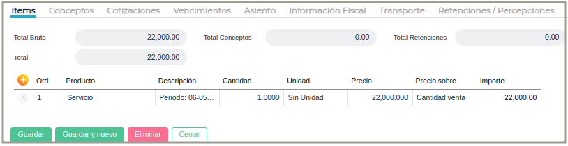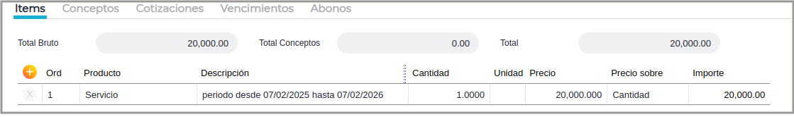 - Fecha vencimiento: es la fecha que se usará para indicar el período dentro de la descripción de los ítems.