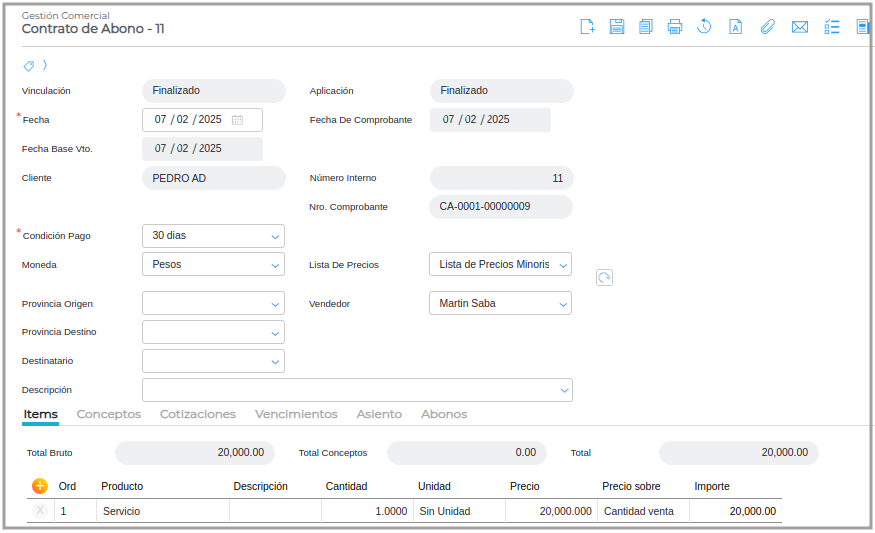 Una vez guardado se completará la Solapa Abonos.